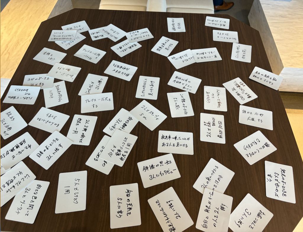4人組でお題の書かれたカードを選び、そこに関する話をお互いに深掘りしていきました。